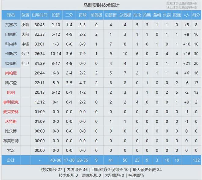 第四节决战,主场作战的湖人起势了。斯玛特单节4记三分,里夫斯上篮打成2+1,最后4分钟湖人追到8分。福克斯和卡斯尔化身客场消音器,三分浇灭湖人反扑。全场战罢,马刺132-119淘汰湖人,恭喜马刺打进NBA杯半决赛。